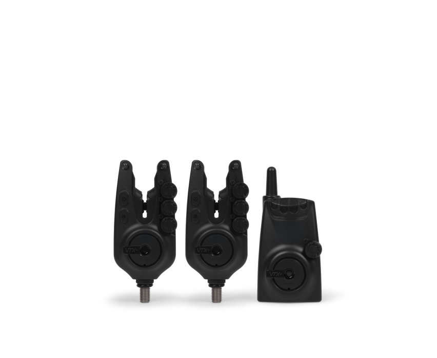 -Bite Alarm Sets – includes two alarm heads and a receiver, complete with clip-on hardcases, receiver lanyard, and screwdriver.