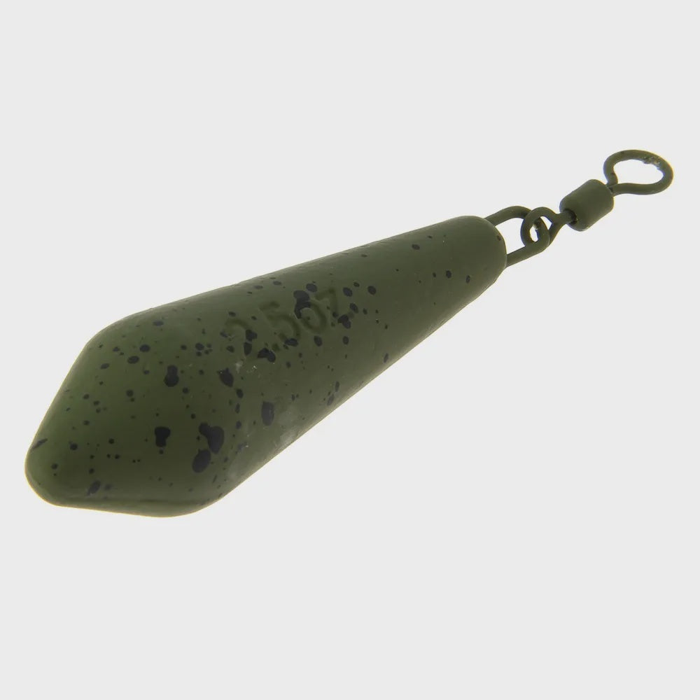 A pack of 10 x 2.50oz distance leads with a dark green, soft touch, non reflective coating with black ‘splash spots’ and size 8 swivel.
