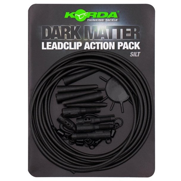 The pack includes: 5 x Lead Clips; 5 x Tail Rubbers; 5 x size 8 Ring Swivels; 10 x retaining pins; 2m of Dark Matter Anti Tangle Tubing. Three different colours are available – weed, gravel, or silt.