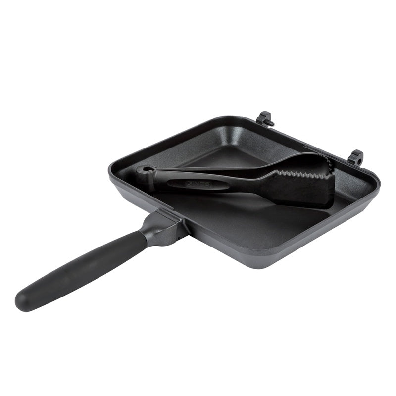 The SONIK SIZZLA range of cookware has been designed with ultimate adaptability, convenience and versatility in mind. The SIZZLA multi-pan is the perfect size for a wide variety of meals with its 30mm depth and wide rectangular profile which provides space to cook a whole host of different ingredients. It is also ultimately portable with a removable handle that features our super tough and secure T-Lock attachment system, which is low profile and allows the pan to be easily stored in even the most compact cook kit. Last but not least, the SONIK SIZZLA comes with a set of extremely useful muti-purpose tongs that are easy to store on the handle whilst cooking and can be separated into two independent cooking utensils when needed.
