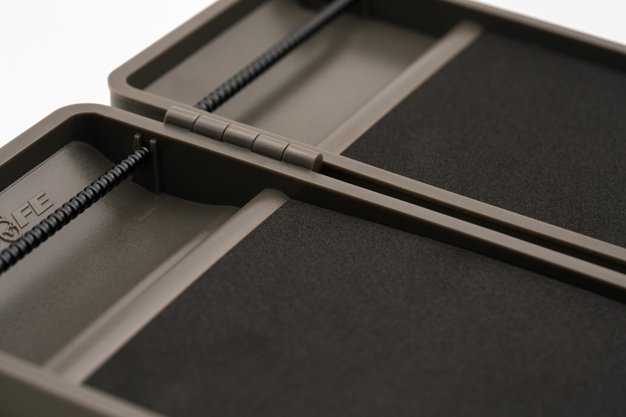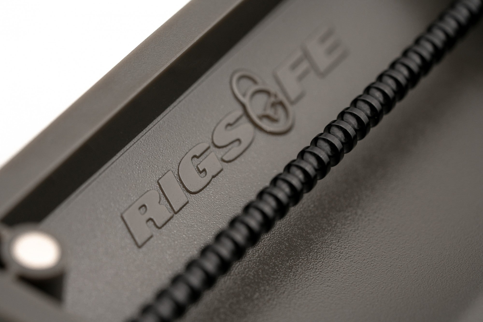 This is a larger version of our original Mini RigSafe and is designed for anyone who either wants to take more pre-tied rigs with them, or who likes to use longer hook links. It holds a huge number of rigs – up to 90, thanks to one side of the case being double-ended, with ridged hook-retaining aluminium bars at either end. It is constructed from rugged, moulded plastic with a soft-touch rubber finish, and is closed via a magnetic locking device that prevents any chance of it opening accidentally. The ridged aluminium bars, along with a recess below them, have been designed to hold hooks securely in place without any chance of damaging the points, and a pin is used to attach the other end of your rig to the robust high density foam boards – or a double pin can be used for unfinished hook links with no swivel or loop, or rigs that are long than 12 inches and need to be doubled up on the boards. The outside of the Large RigSafe also features markings up to 30cm and 12 inches, to help you tie your rigs to the perfect length. It comes complete with 30 single pins and 20 of the double ones.