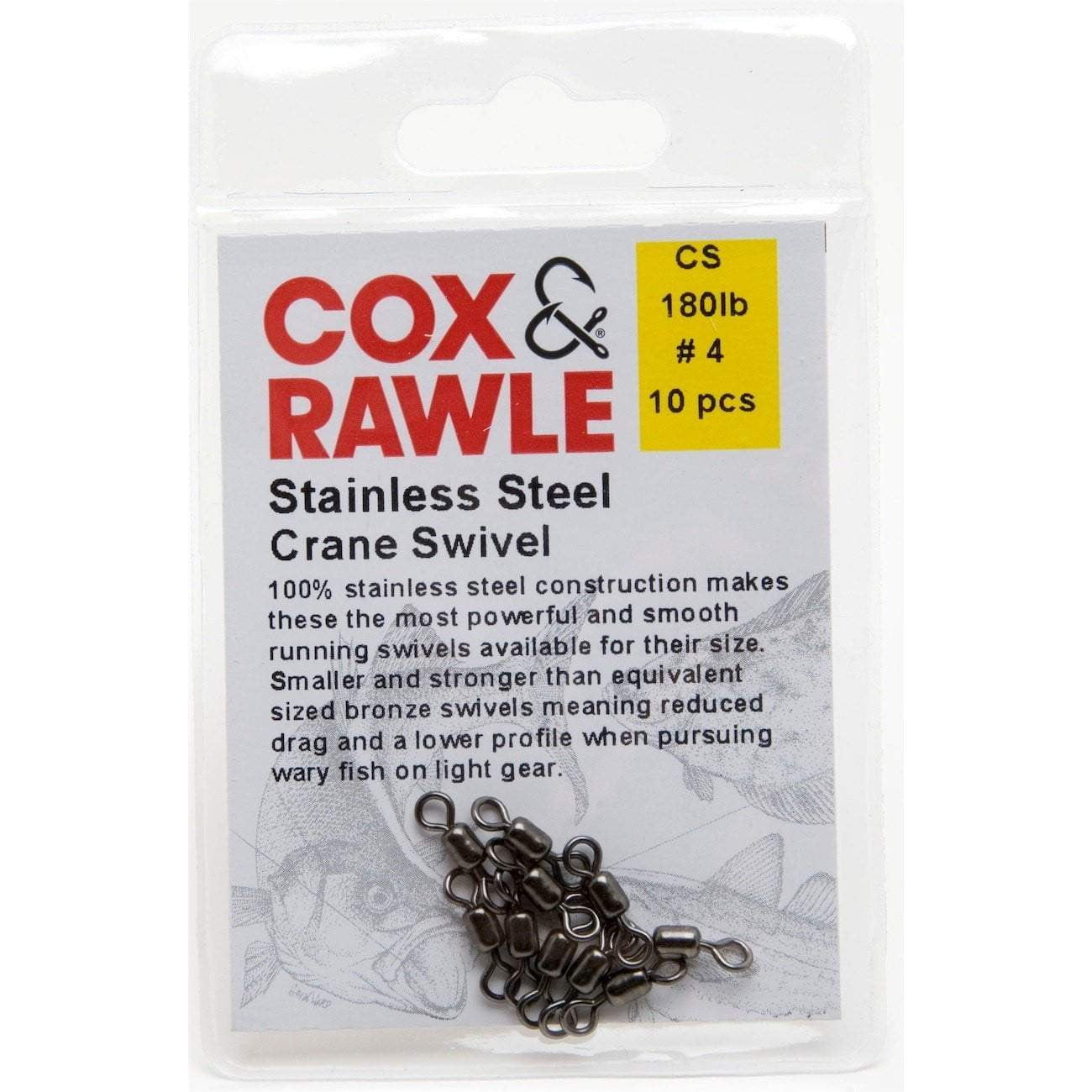 100% stainless steel construction makes these the most powerful and smooth running swivels available for their size.  Cox & Rawle Power Swivels are smaller and stronger than the equivalent sized conventional brass swivels so offer less drag and a lower profile when in pursuit of wary fish on light rigs and traces