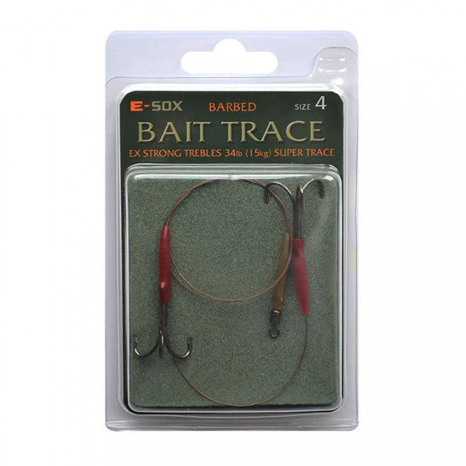 E-Sox Bait Traces are ideal for all live and deadbait presentations. Each trace is 46cm (18in) long and made from strong and reliable nylon-coated 34lb (15kg) Super Trace wire with Extra Strong Trebles. Each trace is finished off neatly with Blood Red Crimp Sleeves on the trebles and a Camo Brown Crimp Sleeve on the swivel. The size 4s have a gap of 11cm between trebles, making them ideal for bigger baits such as half mackerel, herring, lamprey and larger silverfish baits from 16cm to 20cm (6in to 8in). The size 6s have a gap of 9cm between the trebles, making them ideal for medium sized baits from 13cm to 17cm (5in to 6.5in). The size 8s have a gap of 7cm between the trebles, making them excellent for small baits from 10cm to 13cm (4in to 5in). Bait Traces are available in sizes 4, 6 and 8 and in a choice of Barbed or Semi Barbed.