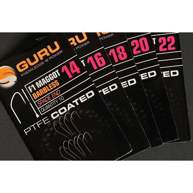 Guru F1 Maggot Hook, The new F1 Maggot hooks will perfectly hold the bait on the bend of the hook with their classic crystal bend, leaving the ultra-sharp point unimpeded. These PTFE-coated, spade-end hooks will be a great edition to your tackle.