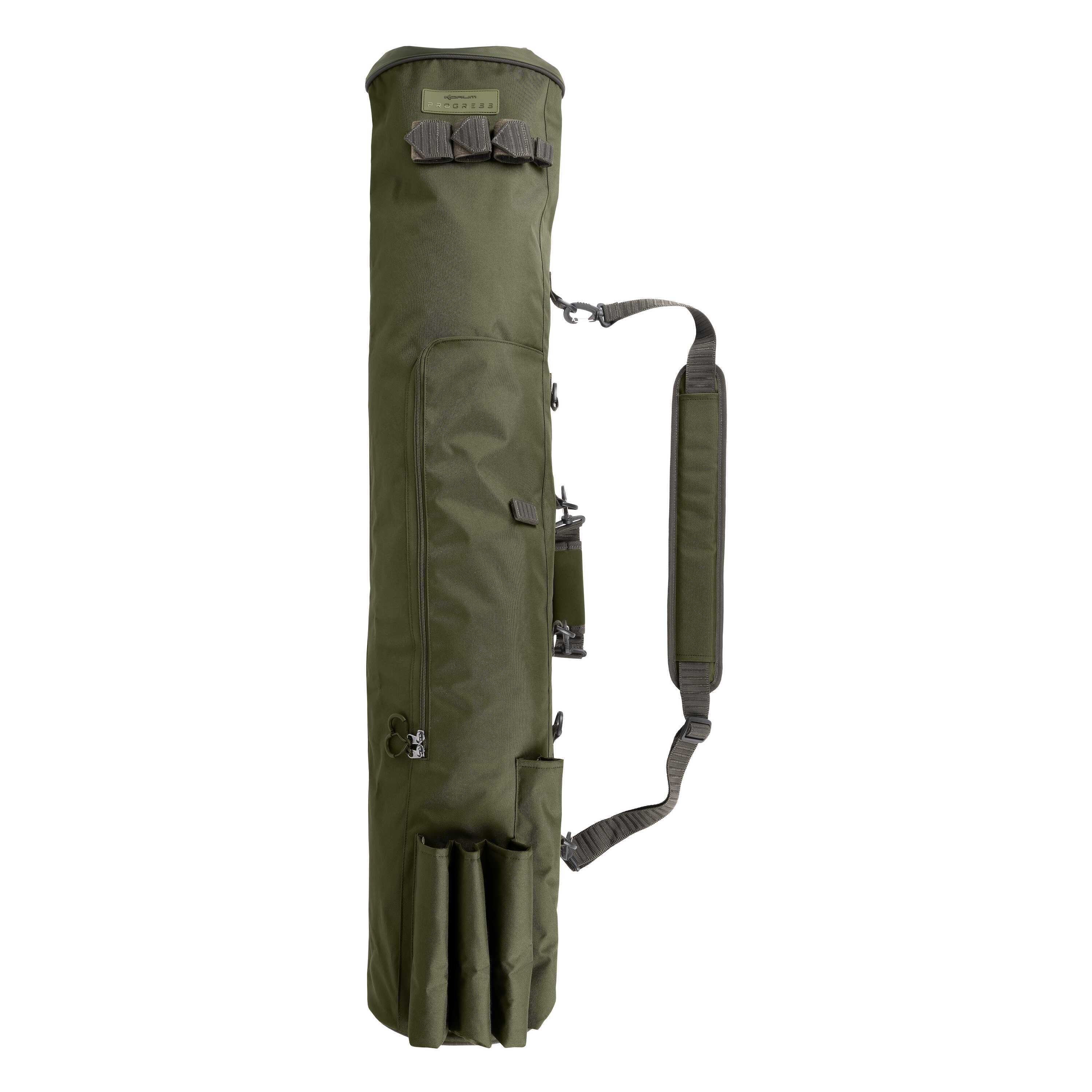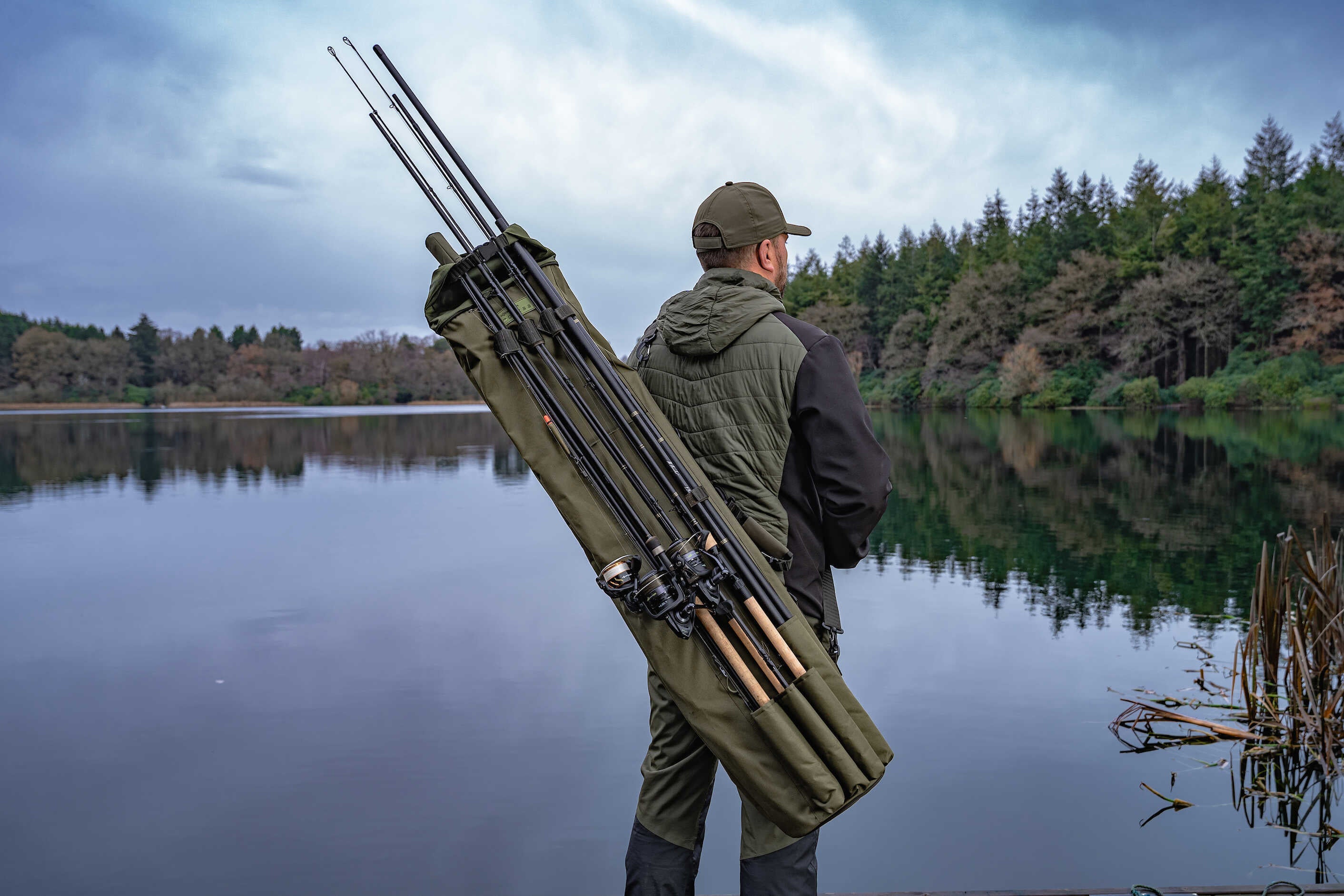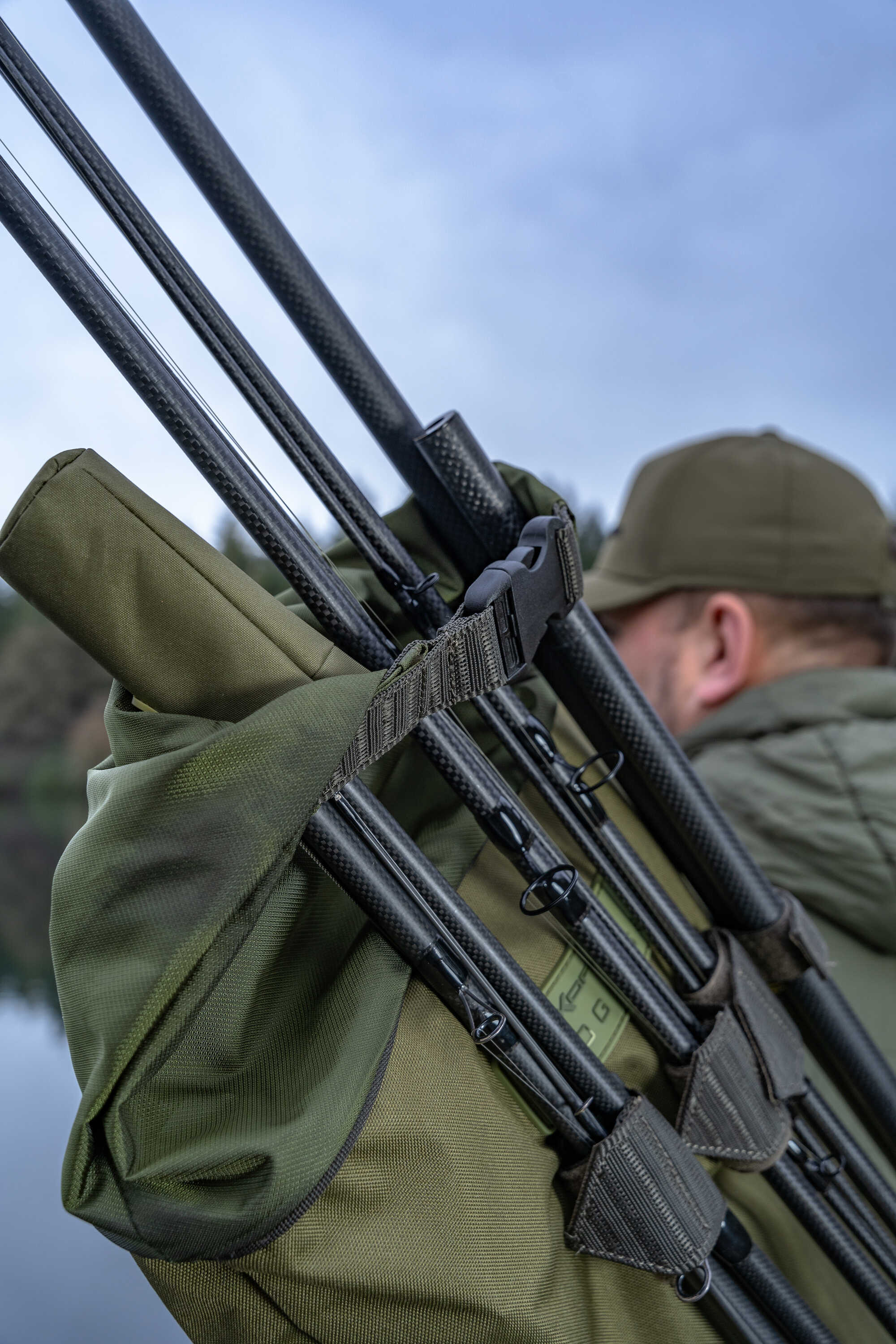 Comfortably houses three rods with enough internal capacity for brollies and overnight shelters. Adapted to provide a bespoke area for your landing net handle. Features simple outer pockets for your bankware and chair accessories. Main compartment features a sealable roll-top function. Removable and adjusted padded shoulder strap for comfortable transportation.