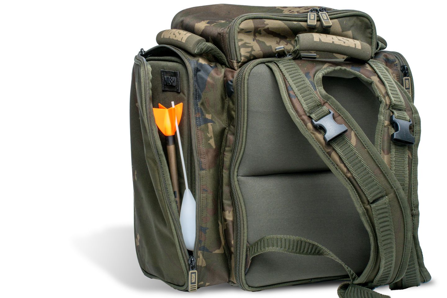 Using the unique Nash design feature of clipped back shoulder straps produces a handy flat worktop surface to support the supplied magnetic tackle tray next to the contents of the main compartment.