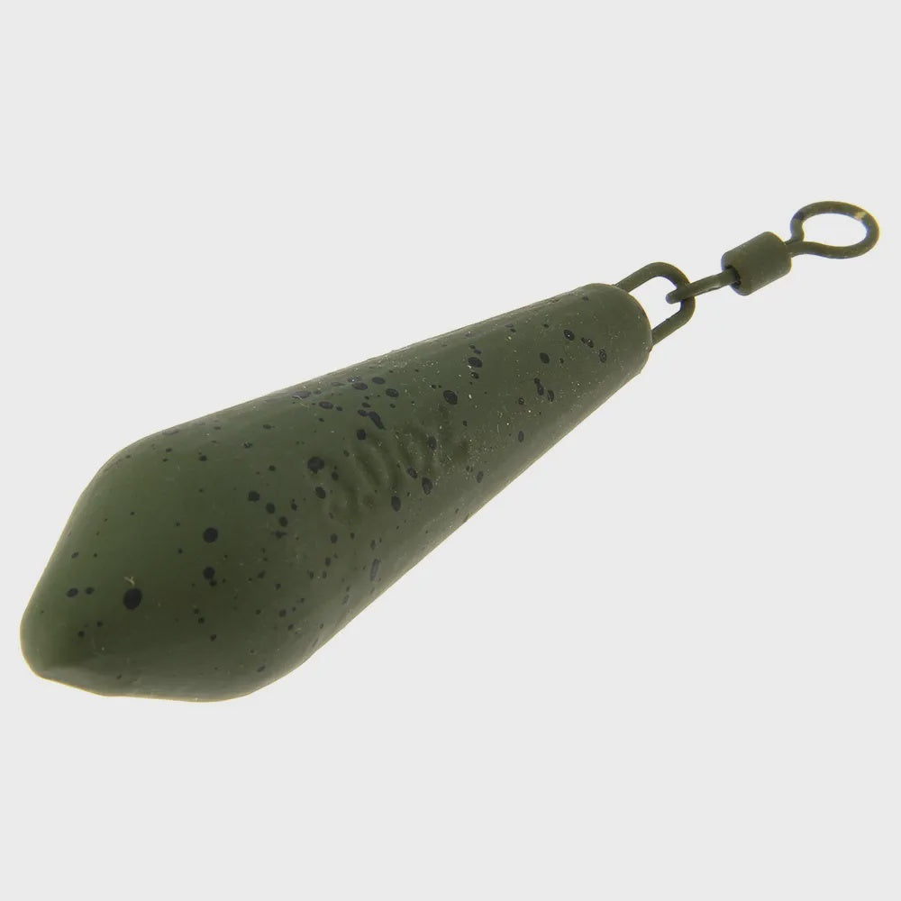 A pack of 10 distance leads with a dark green, soft touch, non reflective coating with black ‘splash spots’ and size 8 swivel.