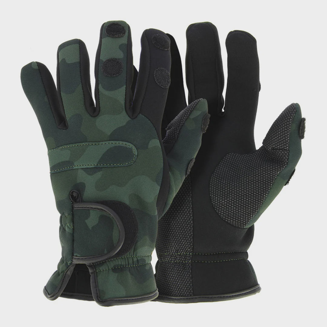 A pair of high quality camouflage neoprene gloves with the option to fold over and velcro down the thumb, index and middle finger.  Also with velcro wrist adjuster.