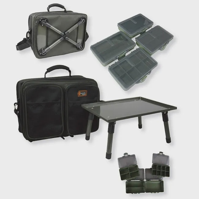 With foldable legs, the Rig Table comes with four accessory boxes, which provide the perfect storage for your hooklengths, rig tools, and plastics, and features an internal mesh pocket, perfect for keeping artificial rig baits, as well as a rig board, to hold hooklengths straight and secure while you work up your rigs.