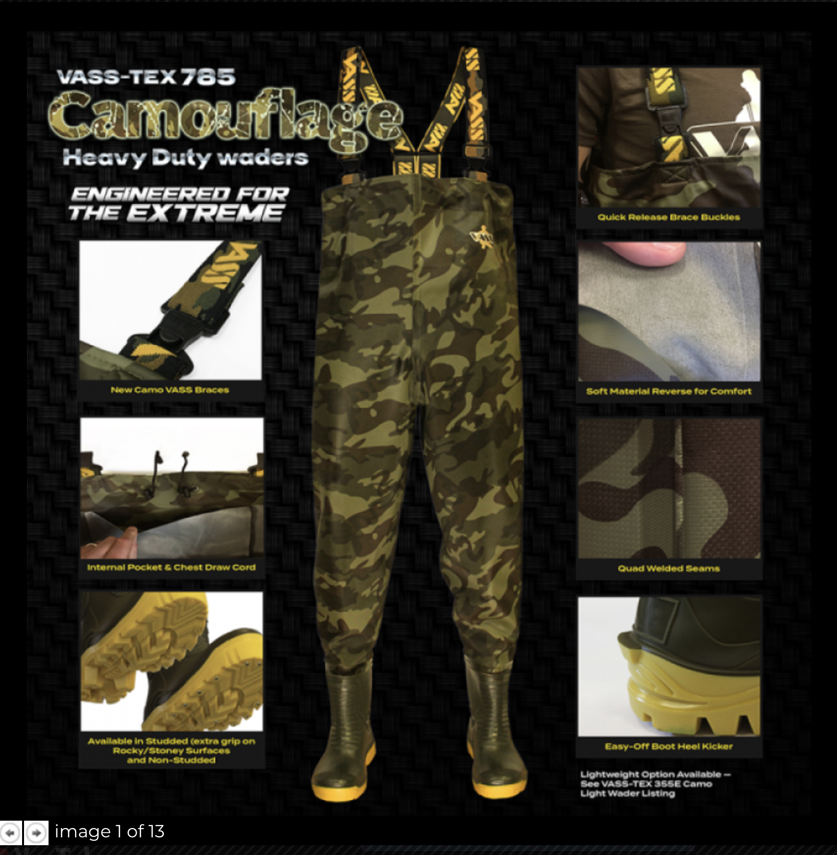Vass are pleased to introduce the new Vass-Tex 785 ‘Heavy Duty’ Camouflage chest wader. The Vass-Tex 785 ‘Camouflage’ wader benefits from the usual high quality workmanship and raw materials anglers have come to expect from Vass. This wader was developed for anglers who require heavy duty waders which also offer comfort and flexibility. The Vass-Tex 785 Camouflage wader will become the successor to the Vass-Tex 800 Camouflage waders in the future!