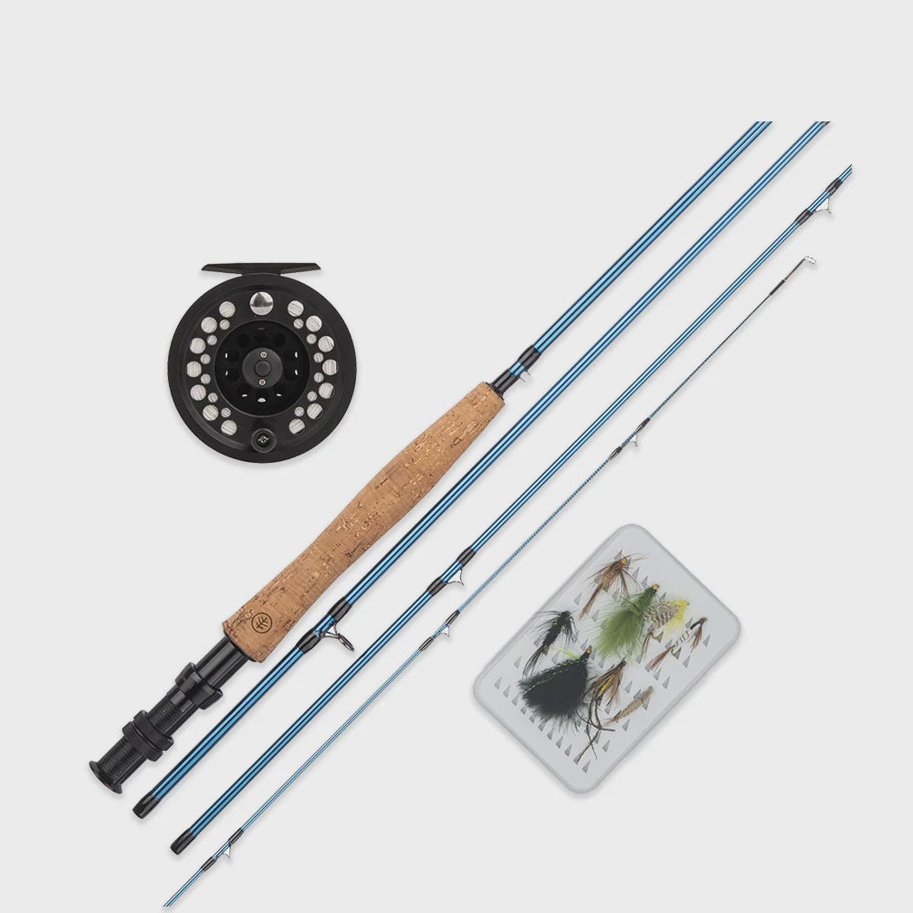 Each kit includes a forgiving multi-modulus 4-piece carbon fly rod, a durable zip-top rod tube, a lightweight graphite fly reel pre-spooled with floating fly line and backing, two tapered monofilament leaders, and a fly box with 8 assorted flies. It's a comprehensive package to get you started and catching fish.